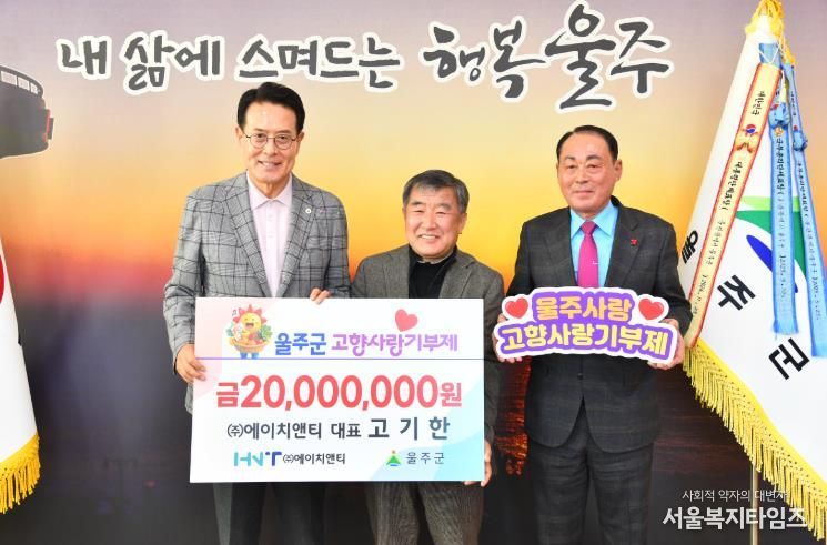서울복지타임즈 이재연 기자 | 고기한 ㈜에이치앤티 대표가 3일 울주군에 고향사랑기부금 연간 최고액인 2천만원을 전달하면서 4년째 고향사랑을 실천하고 있다.