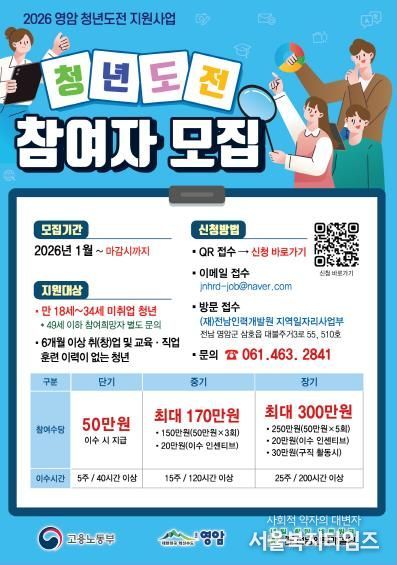 서울복지타임즈 이재연 기자 | 영암군이 (재)전남인력개발원과 ‘2026년 영암군 청년 도전 지원사업’ 참여자를 모집 중이다.