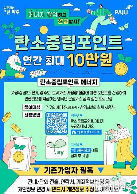 기존 탄소중립포인트제 참여자는 주소 등 개인정보에 변동이 있을 경우, 인터넷을 통해 직접 수정하거나 파주시 기후위기대응과로 통보해 수정해야만 보상금을 지급받을 수 있다.