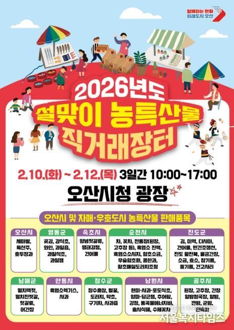 서울복지타임즈 이재연 기자 | 오산시는 설 명절을 맞아 오는 2월 10일부터 12일까지 3일간, 오전 10시부터 오후 5시까지 오산시청 광장에서 자매·우호도시와 함께하는 ‘설맞이 농특산물 직거래장터’를 개최한다고 밝혔다.