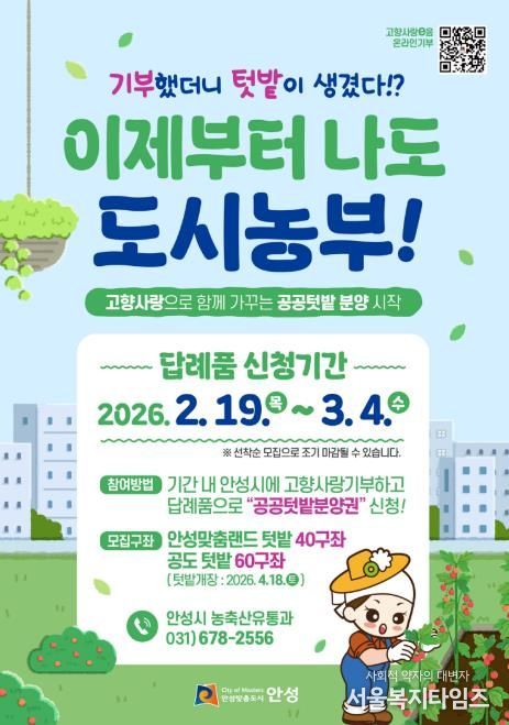 서울복지타임즈 이재연 기자 | 안성시는 오는 2월 19일부터 고향사랑기부제를 통해 도시농업을 체험하는 ‘도시농부’를 모집한다고 밝혔다.