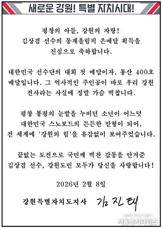 서울복지타임즈 이재연 기자 | 김진태 도지사는 8일 2026 밀라노-코르티나담페초 동계올림픽대회에서 강원특별자치도(하이원 스포츠단) 소속 김상겸 선수의 남자 스노보드 평행대회전 은메달 획득을 축하하며, 축전을 보냈다.