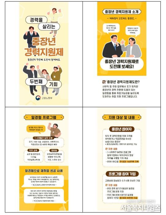 서울복지타임즈 이재연 기자 | 고용노동부는 퇴직 이후 새로운 분야로 재취업을 준비하는 중장년을 대상으로, 실제 직무 경험을 통한 경력 전환을 지원하는 “중장년 경력지원제”를 시행한다.