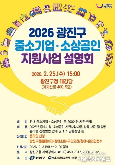 서울복지타임즈 이재연 기자 | 광진구가 2월 25일 광진구청 대강당에서 서울지방중소벤처기업청과 함께 ‘2026 광진구 중소기업‧소상공인 지원사업 설명회’를 개최한다.
