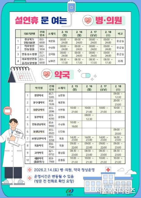 서울복지타임즈 이재연 기자 | 안동시는 설 연휴 기간인 2월 14일부터 18일까지 5일간, 시민이 건강하고 안전하게 연휴를 보낼 수 있도록 응급진료체계를 구성․운영한다.