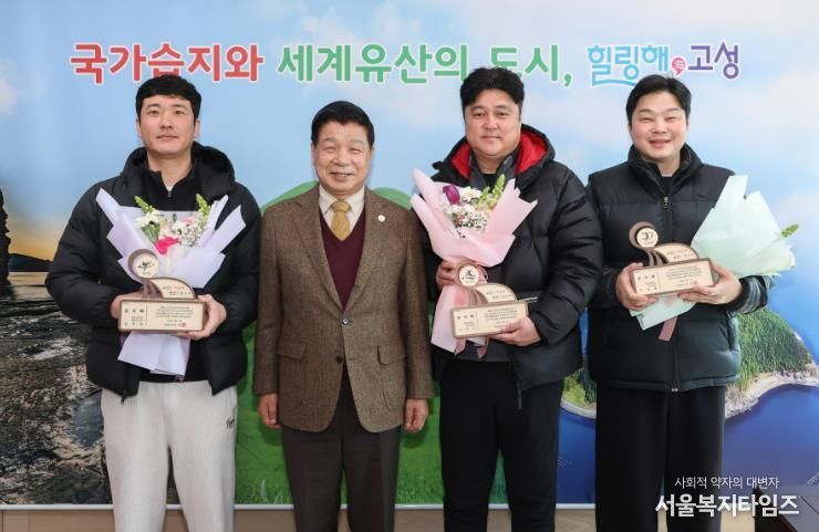 서울복지타임즈 이재연 기자 | 고성군은 2월 11일 오전 11시 군수실에서 동·하계 전지훈련에 지속적으로 참가하며 지역 스포츠산업 발전과 지역경제 활성화에 기여한 지도자들에게 감사패를 수여했다.