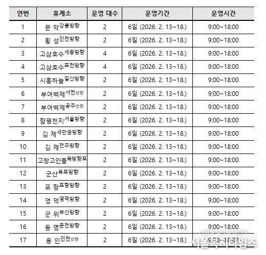 아울러 연휴 기간 중 이용자 불편을 최소화하기 위해 전화상담 창구(☏ 1661-9408) 등 비상연락체계가 운영된다.