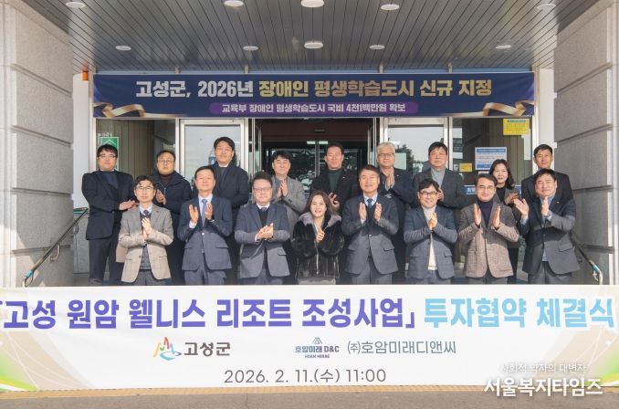 서울복지타임즈 이재연 기자 | 평화 경제 거점 도시 강원 고성군은 2월 11일 군청 본관 회의실에서 ㈜호암미래디앤씨(대표 전은영)와 '고성 원암 웰니스 리조트 조성사업' 투자 협약식을 체결했다고 밝혔다.
