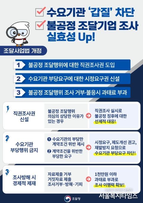 개정안의 핵심은 ‘공정조달 3종 세트’로, 불공정 조달행위에 대한 직권조사 체계를 마련하고, 수요기관의 부당한 요구를 금지하며, 조사·자료 제출 요구 불응 등에 과태료를 부과하는 것이다.
