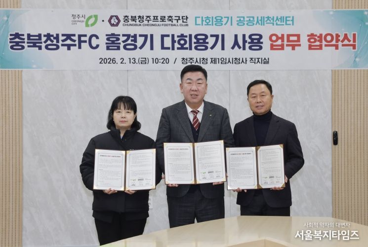 서울복지타임즈 이재연 기자 | 청주시는 13일 충북청주 프로축구단(충북청주FC), 다회용기 공공세척센터와 함께 충북FC 홈경기 다회용기 사용 확대를 위한 업무협약을 체결했다.