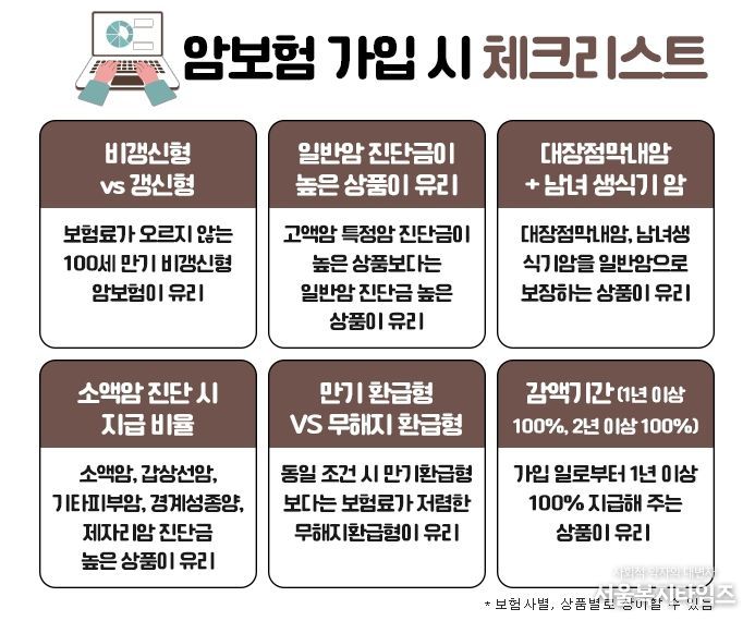 우선, 암보험을 가입하기 위해서는 갱신형 상품과 비갱신형 상품중에서 선택을 해야 한다. 갱신형은 처음 가입 시에는 보험료가 상대적으로 저렴하지만 갱신을 이어가면서 보험료가 계속 인상될 수 있고, 비갱신형은 초기 보험료는 갱신형보다 높을 수 있지만, 가입 후에 보험료인상이 없어 안정적으로 유지관리가 가능한 장점이 있다. 따라서 이러한 장단점을 고려하여 본인의 상황에 맞게 선택하는 것이 좋다.