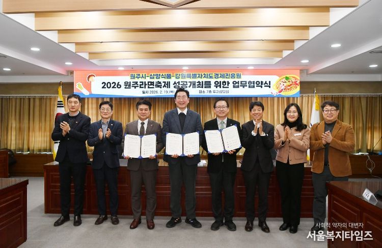 서울복지타임즈 이재연 기자 | 원주시는 ‘2026 원주라면축제’의 성공적인 개최를 위해 19일 오후 2시, 시청 7층 투자상담실에서 삼양식품, 강원특별자치도경제진흥원과 업무협약을 체결했다.