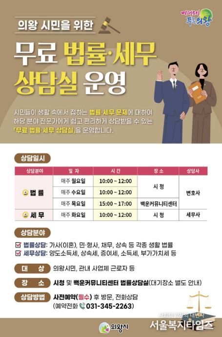 서울복지타임즈 이재연 기자 | 의왕시가 시민들의 생활 속 법률·세무 고민 해결을 위한 ‘무료 법률‧세무 상담실’을 연중 운영하고 있다.