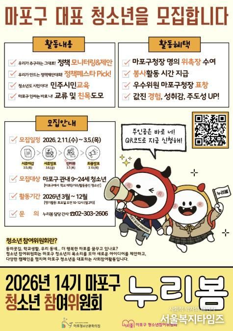 서울복지타임즈 이재연 기자 | 마포구는 청소년이 정책의 대상이 아닌 정책의 주체로 참여할 수 있도록 제14기 마포구 청소년참여위원회 ‘누리봄’ 위원을 모집한다.