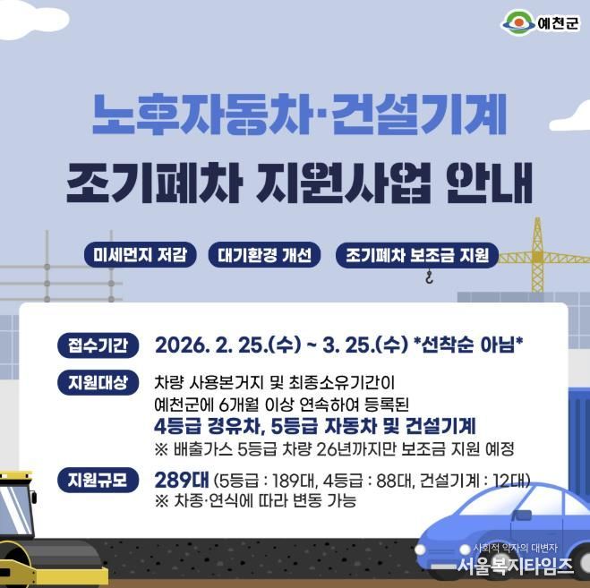 서울복지타임즈 이재연 기자 | 예천군은 노후자동차 및 건설기계에서 배출되는 미세먼지 및 질소산화물 등 대기오염물질 저감을 위해 ‘2026년 노후자동차 및 건설기계 조기폐차 지원사업’을 시행 중이다.