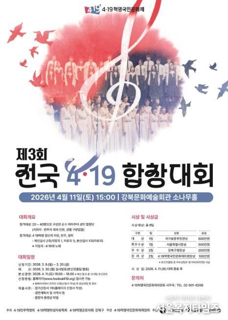 서울복지타임즈 이재연 기자 | 서울 강북구가 오는 4월 11일 오후 3시 강북문화예술회관 소나무홀에서 '제3회 전국 4·19 합창대회'를 개최한다.
