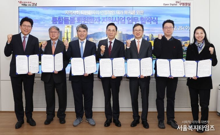 서울복지타임즈 김두화 기자 | 꿈이 모이는 도시, 미래를 그리는 강남구가 퇴원 이후 돌봄 공백을 줄이고 지역사회 중심의 돌봄 체계를 강화하기 위해 2월 25일 구청에서 관내 6개 의료기관과 '통합돌봄 퇴원환자 지원사업' 추진을 위한 업무협약(MOU)을 체결했다. 협약 기관은 삼성서울병원, 연세대학교의과대학 강남세브란스병원, 강남베드로병원, 나누리병원, 메드렉스병원, 강남구립행복요양병원이다.