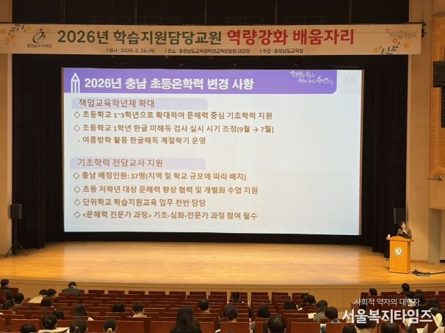 서울복지타임즈 이재연 기자 | 충남교육청은 26일 충남교육청학생교육문화원(천안)에서 2026년 학습 지원 담당 교원 410명과 14개 시군 교육지원청 기초학력 담당 장학사를 대상으로 배움자리를 개최했다.