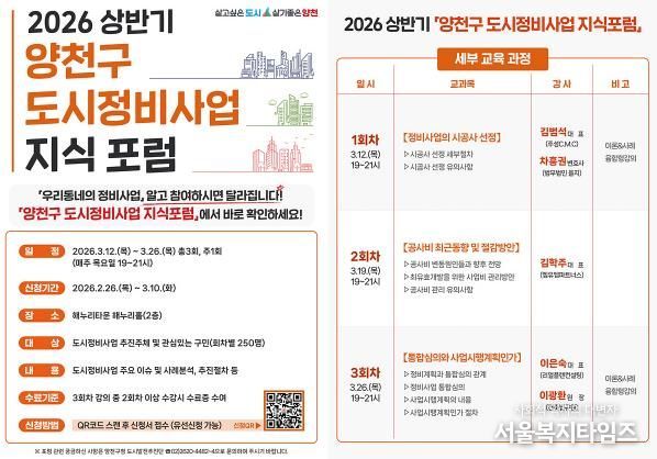 서울복지타임즈 이재연 기자 | 양천구는 재건축·재개발 등 주요 도시정비사업이 본격화되는 시점에 맞춰 조합 임·직원과 주민을 대상으로 ‘2026년 상반기 도시정비사업 지식포럼’을 개최한다고 밝혔다.