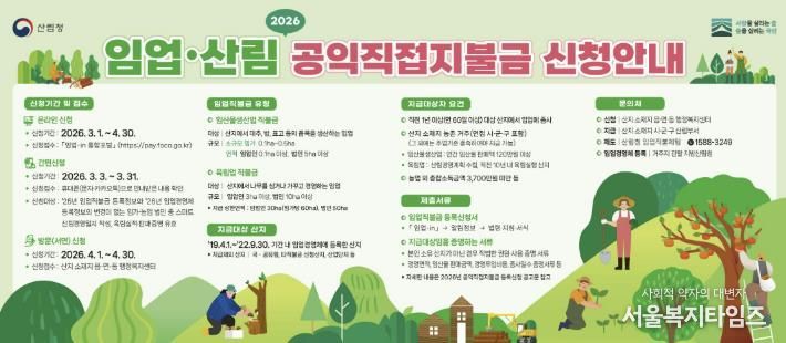 서울복지타임즈 이재연 기자 | 동두천시는 2026년 임업·산림 공익직접지불금 신청 접수를 3월 1일부터 4월 30일까지 실시한다.