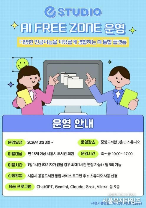 서울복지타임즈 이재연 기자 | 시흥시중앙도서관은 시민들의 인공지능(AI) 활용 역량 강화를 위해 시 정보통신과와 협업해 도서관 3층 e-스튜디오에 ‘인공지능(AI) 프리 존(Free Zone)’을 구축하고, 오는 3월 3일부터 본격 운영에 들어간다.