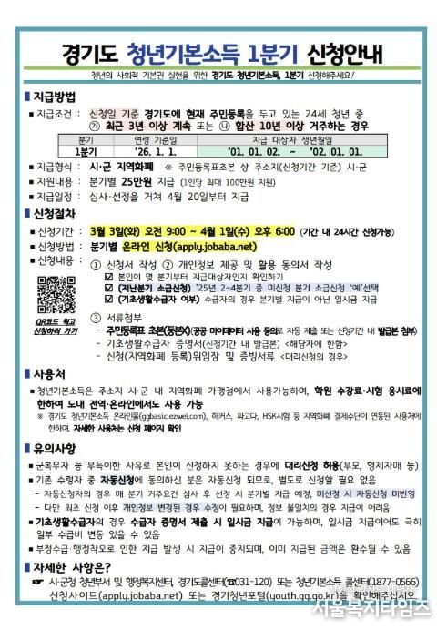 서울복지타임즈 이재연 기자 | 동두천시는 2026년 1분기 청년기본소득 신청․접수를 3월 3일부터 4월 1일까지 한 달 간 접수한다고 밝혔다.