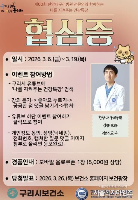 특강은‘구리비전’ 채널을 통해 시청할 수 있다. 시청 후 6일부터 19일까지 궁금한 사항을 댓글로 남기면 우수질문 3건을 선정해 한양대구리병원 심장내과 김병식 교수가 직접 답변할 예정이다. 또한 참여자 중 17명을 무작위로 선정해 우수 질문자 3명을 포함한 총 20명에게 모바일 쿠폰을 증정한다.
