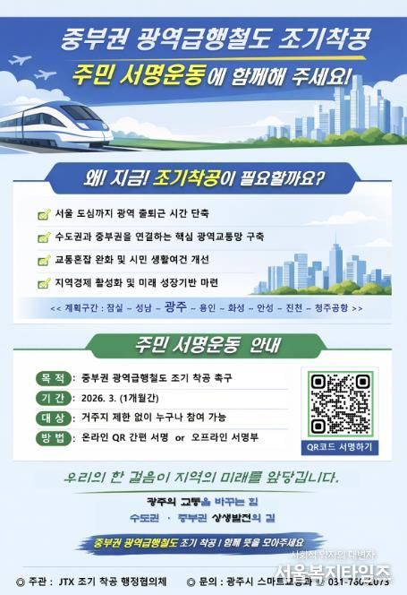 서울복지타임즈 이재연 기자 | 광주시는 중부권 광역급행철도의 조기 착공을 촉구하기 위해 3월 한 달간 주민 서명운동을 한다고 6일 밝혔다.