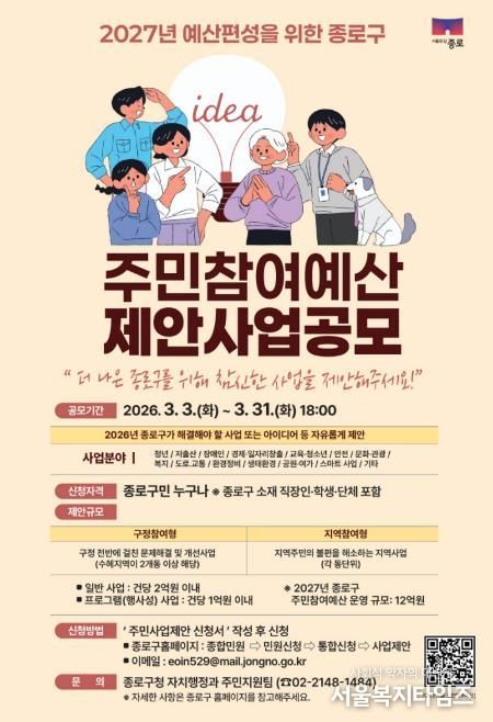 또한 실효성 있는 제안 발굴을 위해 3월 13일 14시부터 17시까지 웰니스센터(율곡로 89)에서 ‘2026년 종로구 주민참여예산학교’를 개최한다.