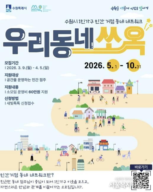 수원시 관계자는 “우리동네 쏘옥은 시민들이 자주 찾는 동네 공간을 소통 거점으로 활용해 1인가구가 자연스럽게 관계를 이어갈 수 있도록 돕는 사업”이라며 “민간 공간 운영자들의 많은 관심과 참여를 바란다”고 말했다.
