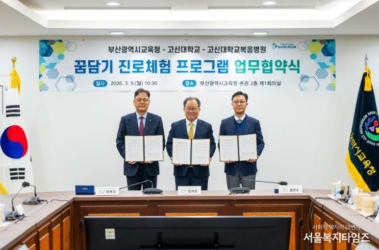 서울복지타임즈 이재연 기자 | 부산광역시교육청은 9일 오전 교육청 회의실에서 고신대학교, 고신대학교복음병원과 ‘꿈담기 진로체험 프로그램’운영을 위한 업무협약을 체결했다.
