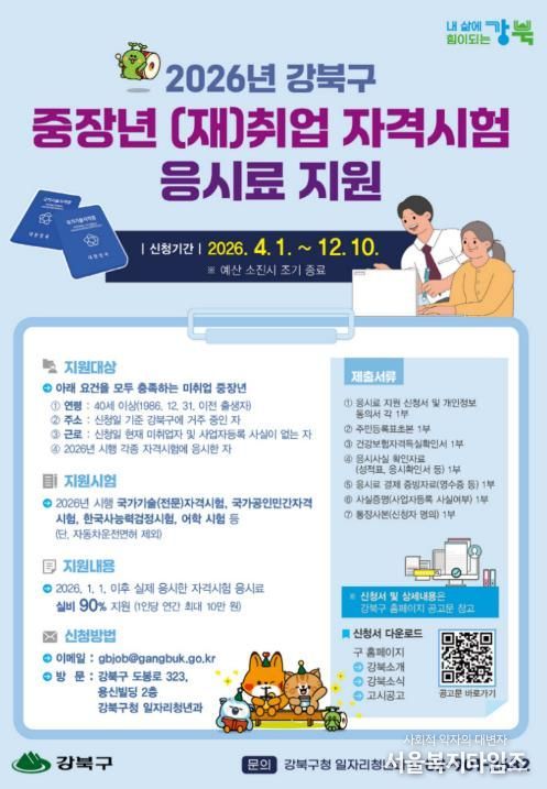 이순희 강북구청장은 “이번 지원사업이 중장년층의 경제적 부담을 덜고 재취업 준비에 실질적인 도움이 되길 바란다”며 “앞으로도 구민의 취업 기회를 확대하고 안정적인 경제활동을 지원하기 위한 정책을 지속적으로 추진하겠다”고 말했다.