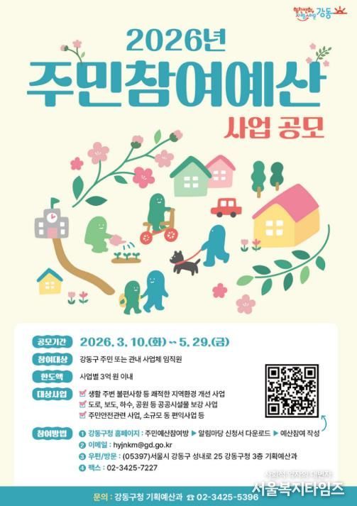 서울복지타임즈 이재연 기자 | 서울 강동구는 내년도 예산 편성에 반영할 주민제안사업을 올해 3월 10일부터 5월 29일까지 공모한다고 밝혔다.