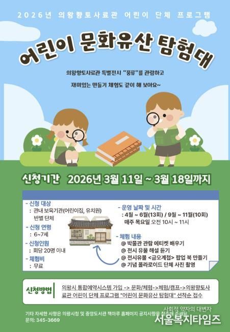 서울복지타임즈 이재연 기자 | 의왕시 향토사료관이 오는 4월부터 6월, 9월부터 10월 매주 목요일에 어린이 단체 체험프로그램 ‘어린이 문화유산 탐험대’를 운영한다.