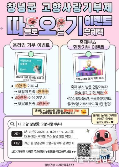 서울복지타임즈 이재연 기자 | 창녕군은 고향사랑기부제 참여 확대와 기부 문화 확산을 위해 ‘따.오.기.(따블로 오는 기부 혜택) 이벤트’를 추진한다.