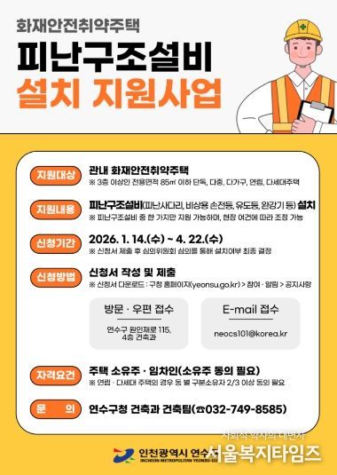 이에 연수구는 2023년부터 3층 이상이면서 전용면적 85㎡ 미만인 소규모 주택에 피난사다리, 유도등, 휴대용 비상조명, 완강기 등 피난구조설비 설치를 지원하는 사업을 시행하고 있다.