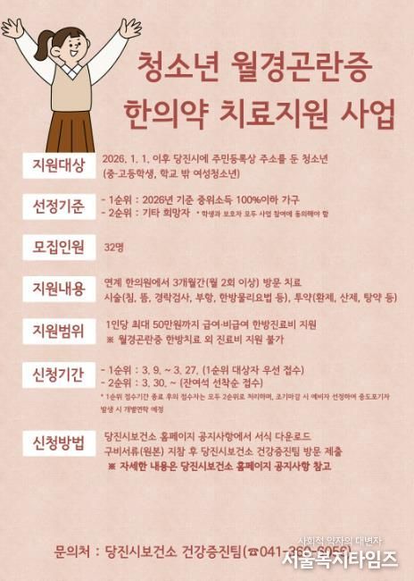 신청 자격은 2026년 1월 1일 기준 당진시에 주소를 둔 청소년(중고등학교, 학교 밖 청소년 여학생)이며, 선정 기준은 1순위로 2026년 기준 중위소득 100% 이하 가구, 2순위로 월경통 치료를 희망하는 여성 청소년이다.