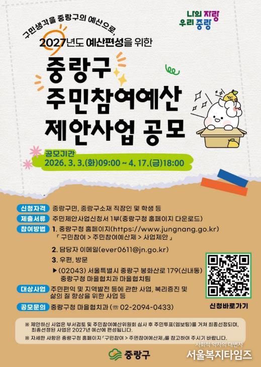 서울복지타임즈 이재연 기자 | 중랑구가 2027년도 예산에 반영할 주민참여예산 사업을 발굴하기 위해 오는 3월 3일부터 4월 17일까지 총 11억 원 규모의 주민참여예산 제안사업 공모를 실시한다.