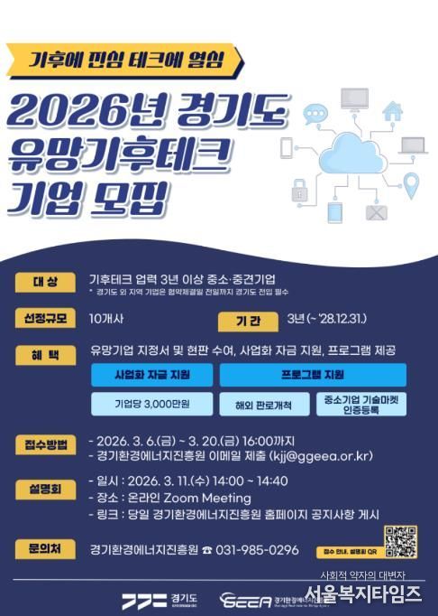 서울복지타임즈 이재연 기자 | 경기도와 경기환경에너지진흥원이 기후위기 대응을 선도할 혁신 기술 보유 기업을 발굴하기 위해 오는 3월 20일까지 ‘2026년 경기도 유망 기후테크 기업’ 10곳을 모집한다.