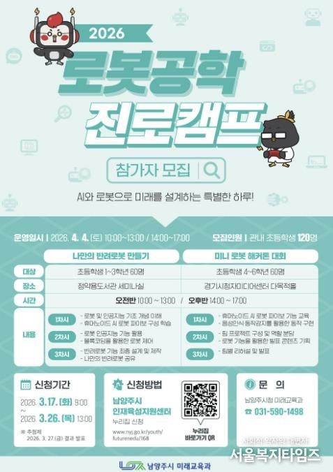서울복지타임즈 이재연 기자 | 남양주시는 오는 17일부터 ‘2026년 로봇공학 진로캠프’ 참가자를 모집한다고 13일 밝혔다.