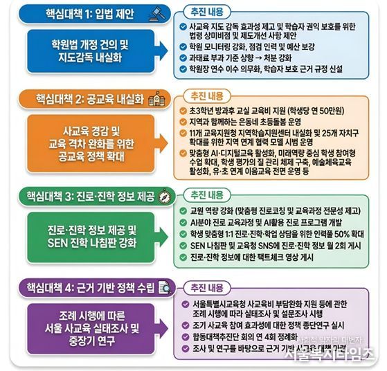 서울시교육청은 추진계획에 따른 결과로 사교육 경감 수립의 근거를 마련했으며, 이를 바탕으로 다음과 같이 ‘4대 핵심 대책’을 수립했다.