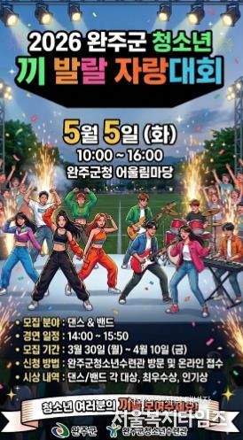 서울복지타임즈 이재연 기자 | 완주군이 오는 5월 5일 제104회 어린이날에 아동과 청소년들이 주인공이 되어 숨겨진 재능과 에너지를 마음껏 발산할 수 있는 ‘2026 완주군 아동·청소년 끼 발랄 자랑대회’를 개최한다.
