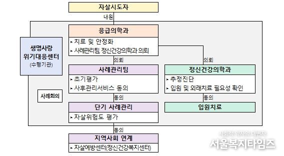 사업 참여 병원에서는 응급치료와 함께 정신건강의학과 진료 의뢰, 초기상담 및 위험도 평가를 실시하고, 병원에서 단기 사례관리(4회)를 거쳐 자살예방센터·정신건강복지센터 등 지역사회 자원으로 연계한다.