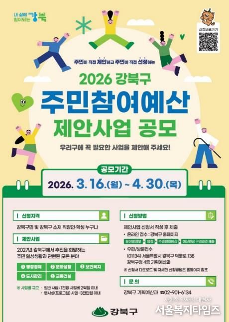 서울복지타임즈 이재연 기자 | 서울 강북구가 구민의 다양한 의견을 구정에 반영하기 위해 오는 4월 30일까지 ‘2026년 강북구 주민참여예산 제안사업’을 공모한다.