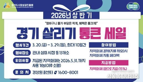 서울복지타임즈 이재연 기자 | 시흥시는 고물가로 위축된 민생경제에 활력을 불어넣고 소상공인의 매출 증대를 돕기 위해 오는 3월 20일부터 29일까지 관내 전역에서 ‘2026년 상반기 경기 살리기 통큰 세일’을 개최한다.