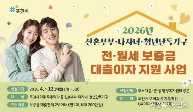 서울복지타임즈 이재연 기자 | 포천시는 ‘2026년 신혼부부·다자녀·청년가구 전월세 보증금 대출이자 지원사업’을 추진한다.