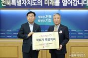서울복지타임즈 이재연 기자 | 전북특별자치도는 2일 도청에서 대한적십자사 전북지사에 2026년도 적십자 특별회비 500만 원을 전달했다. 이번 전달식은 2026년도 적십자 모금 개시를 알리는 제1호 특별회비 전달식으로 진행됐으며, 김관영 도지사가 직접 특별회비를 전했다. 전달식에는 대한적십자사 전북지사 김홍식 회장과 임직원이 참석해 지역사회 나눔 실천의 의미를 함께했다. 전북도는 매년 적십자 특별회비를 기탁하며 도민 참여 확산과 기부문화 정착에 앞장서고 있다. 적십자 특별회비는 지역 취약계층 긴급지원, 재난 대비 및 구조 활동, 헌혈 활성화, 안전교육 등 다양한 인도주의 사업에 활용된다. 특히 기후변화로 인한 자연재해 증가와 복지 사각지대 확대 속에서 적십자 활동의 중요성이 더욱 강조되고 있다. 내년도 대한적십자사 전북지사의 적십자회비 모금 목표는 12억 4천만 원이며, 2026년 1월 31일까지 집중 모금기간을 운영하고 있다. 김관영 도지사는 “적십자 특별회비는 어려운 이웃을 돕고 재난 상황에서 생명을 지키는 데 중요한 역할을 한다”며 “전북도는 앞으로도 도민들과 함께 지역 공동체를