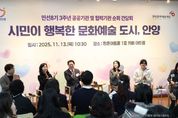 서울복지타임즈 이재연 기자 | 안양시는 13일 오전 10시 30분 평촌아트홀 1층 카페 아트림에서 ‘시민이 행복한 문화예술 도시, 안양’을 주제로 (재)안양문화예술재단과 민선 8기 3주년 공공·협력기관 순회 간담회를 개최했다. 이번 간담회는 민선8기 3주년을 맞아 안양시 문화예술 정책의 주요 성과를 공유하고, 현장 예술인과 시민의 의견을 직접 청취하기 위해 마련됐다. 행사에는 안양 지역 예술인과 문화단체 관계자, 시민 등 120여 명이 참석해 안양의 문화예술 비전과 발전 방향에 대해 활발한 소통의 시간을 가졌다. 간담회에서는 ▲시민이 주인공이 되는 ‘안양춤축제’ ▲생활문화로 피어나는 ‘마을축제 지원사업’ ▲지역·청년예술인 창작활동 지원 ▲안양박물관과 공공예술프로젝트(APAP) 등 시민이 함께 만들어가는 다양한 문화예술 사례가 소개됐다. 안양춤축제는 안양만의 축제가 아니라 관광형 축제로 거듭나고 있다. 지난 9월 3일간 열린 축제에는 총 14만2,000여명이 참여했는데, 이 중 40%가 타 시도민으로 추산된다. 춤축제 기간 열린 유스클럽챔피언십의 한 고등학생 참가자는 “대회 분위기가 생각보다 훨씬 뜨거웠고 행복했