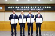 서울복지타임즈 이재연 기자 | 충주시는 31일 시청 중회의실에서 2027년 하계세계대학경기대회의 성공적인 개최와 문화예술 발전을 위해 국립한국교통대학교, 건국대학교 글로컬캠퍼스, 충주시체육회와 공식 업무협약을 체결했다. 이번 협약은 지역 주요 체육관과 충주문화회관의 리모델링 공사로 경기장과 문화시설 활용이 일시적으로 제한됨에 따라, 지역 대학교 시설을 비롯한 각종 지원 협력을 공식화하기 위해 마련됐다. 협약식에는 조길형 충주시장, 윤승조 국립한국교통대학교 총장, 최영근 건국대학교 글로컬캠퍼스 부총장, 진용섭 충주시체육회장 등이 참석해 전문체육 및 생활체육 활성화, 문화예술 발전 등을 위한 협력 강화, 협약 기관 간 인적 인프라 지원 등 다양한 분야에서 협력하기로 뜻을 모았다. 협약을 통해 각 기관의 체육관 등 시설 대관 시 적극적인 협조를 받고, 주요 행사 진행 시 기관 간 자원봉사 등 인프라 지원이 이뤄질 것으로 기대된다. 조길형 시장은 “2027년 U대회 성공 개최와 문화예술 발전을 위해 모두가 한 데 힘을 모으는 좋은 계기가 마련됐다”라며, “이번 U대회는 대학생들과 지역사회 모두가 어우러져