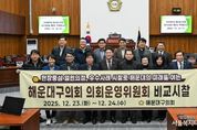 서울복지타임즈 이재연 기자 | 해운대구의회 의회운영위원회는 지난 12월 23일부터 24일까지 1박 2일간의 일정으로 경주시 일원을 방문해 선진 의회 시설을 비교·분석하고 의정 역량 강화를 위한 벤치마킹을 실시했다. 이번 시찰에는 김상수 의회운영위원장과 해운대구의회 의장을 포함한 의원 10명, 의회사무국 직원 4명 등 총 14명이 참여했다. 시찰단은 24일 오전 경주시의회를 공식 방문하여 약 3년 전 전면 리모델링을 통해 현대화된 청사 시설을 중점적으로 둘러보았다. 시찰단은 특히 본회의장과 각 상임위원회 회의실이 최신식 설비로 갖춰진 점과, 각 상임위원장실이 별도로 마련되어 있고 넓고 쾌적한 의원 사무실이 조성되어 있는 등 의정 활동을 지원하는 인프라가 매우 우수하다는 점에 주목했다. 현장을 둘러본 의원들은" 경주시의회의 경우 상임위원장실과 의원 연구 공간이체계적으로 분리·배치되어 있고, 회의실 시설 또한 현대적으로 개선되어 있어 의정 활동의 효율성을 높이는 데 크게 기여하고 있다"고 평가했다. 또한, 직원들의 사무 공간이 업무 집중도를 높일 수 있도록 효율적으로 배치된 점과 모든 직원이
